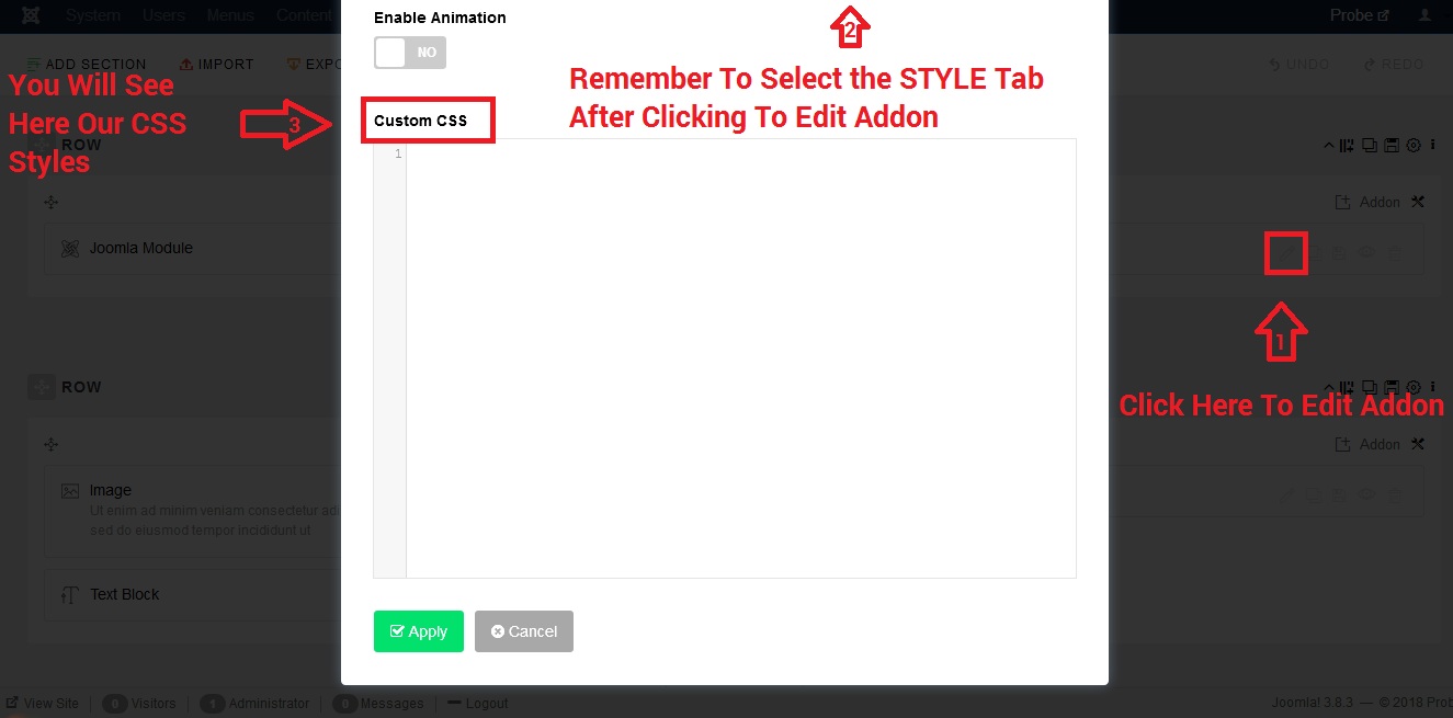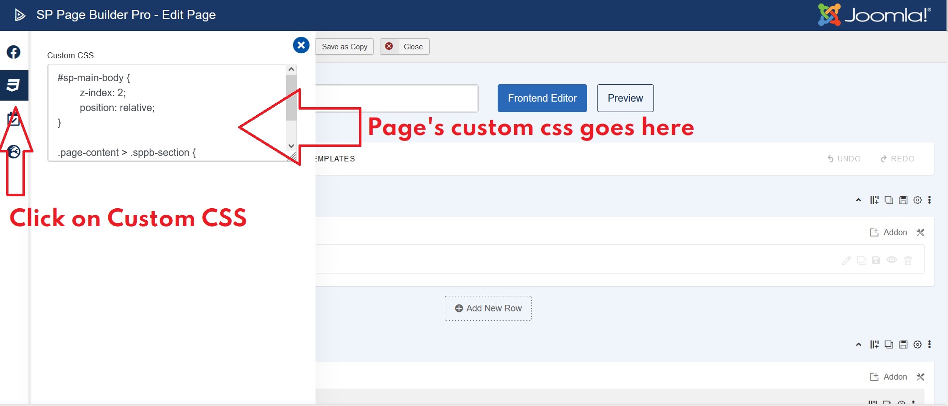 - You can change it anytime by going to SP Page Builder -> Pages -> Select page -> Select edit addon -> Go to STYLE tab and scroll down until you find Custom CSS section (see image below)